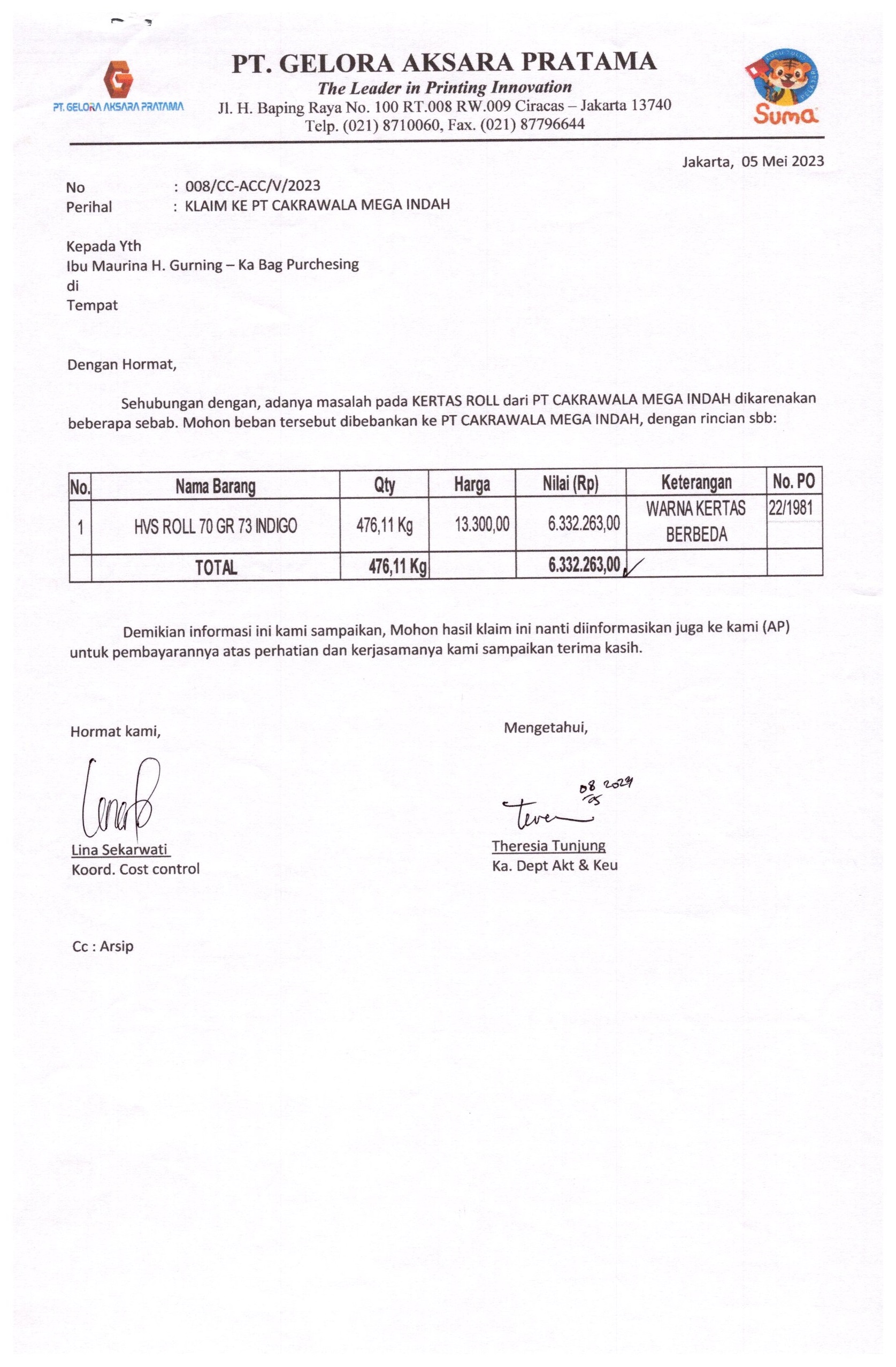 Supplier Name Cakrawala Mega Indah Complaint No. :